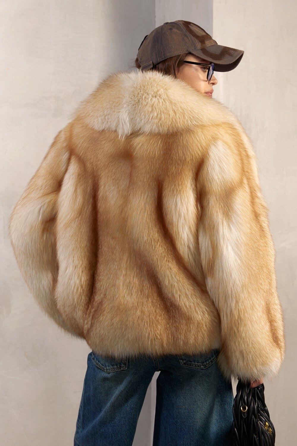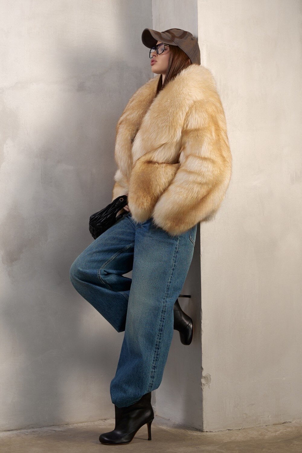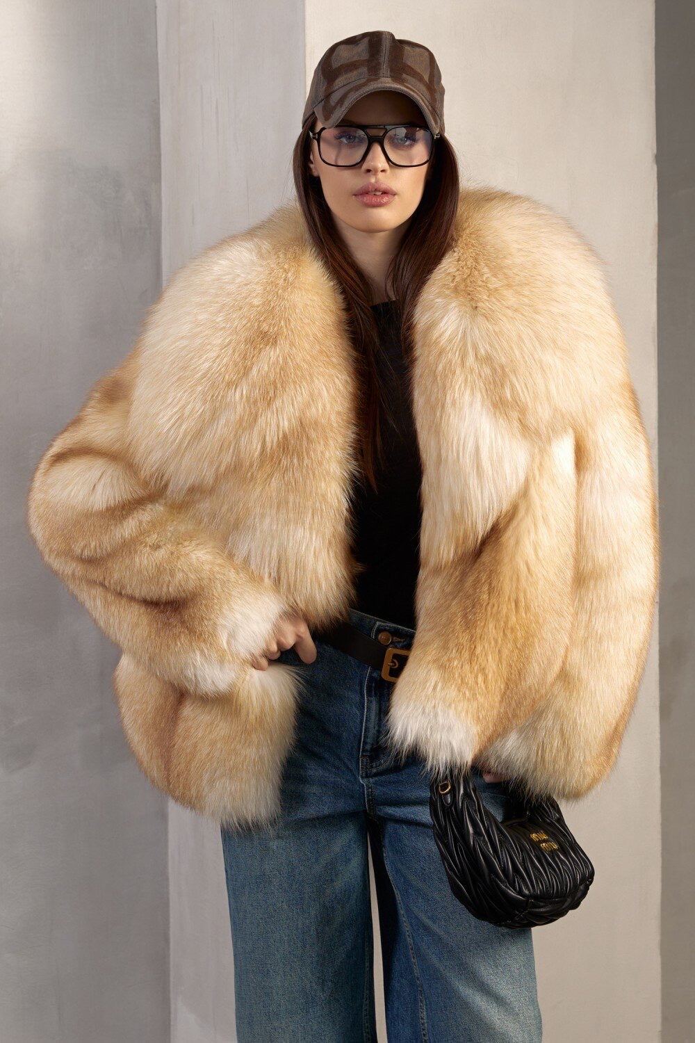 A woman wearing a full pelt gold fox fur coat, showcasing its bold and luxurious texture, perfect for making a refined winter statement.