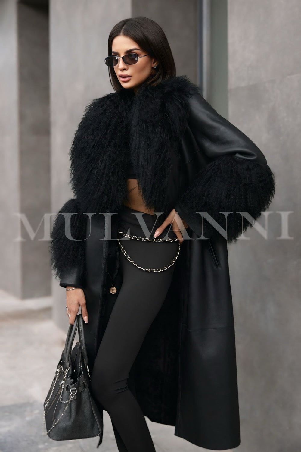 A woman wearing a chic black leather trench coat, enhanced by Mongolian fur detailing on the collar and cuffs. The coat's sleek design and warm materials offer both elegance and comfort for cold seasons.