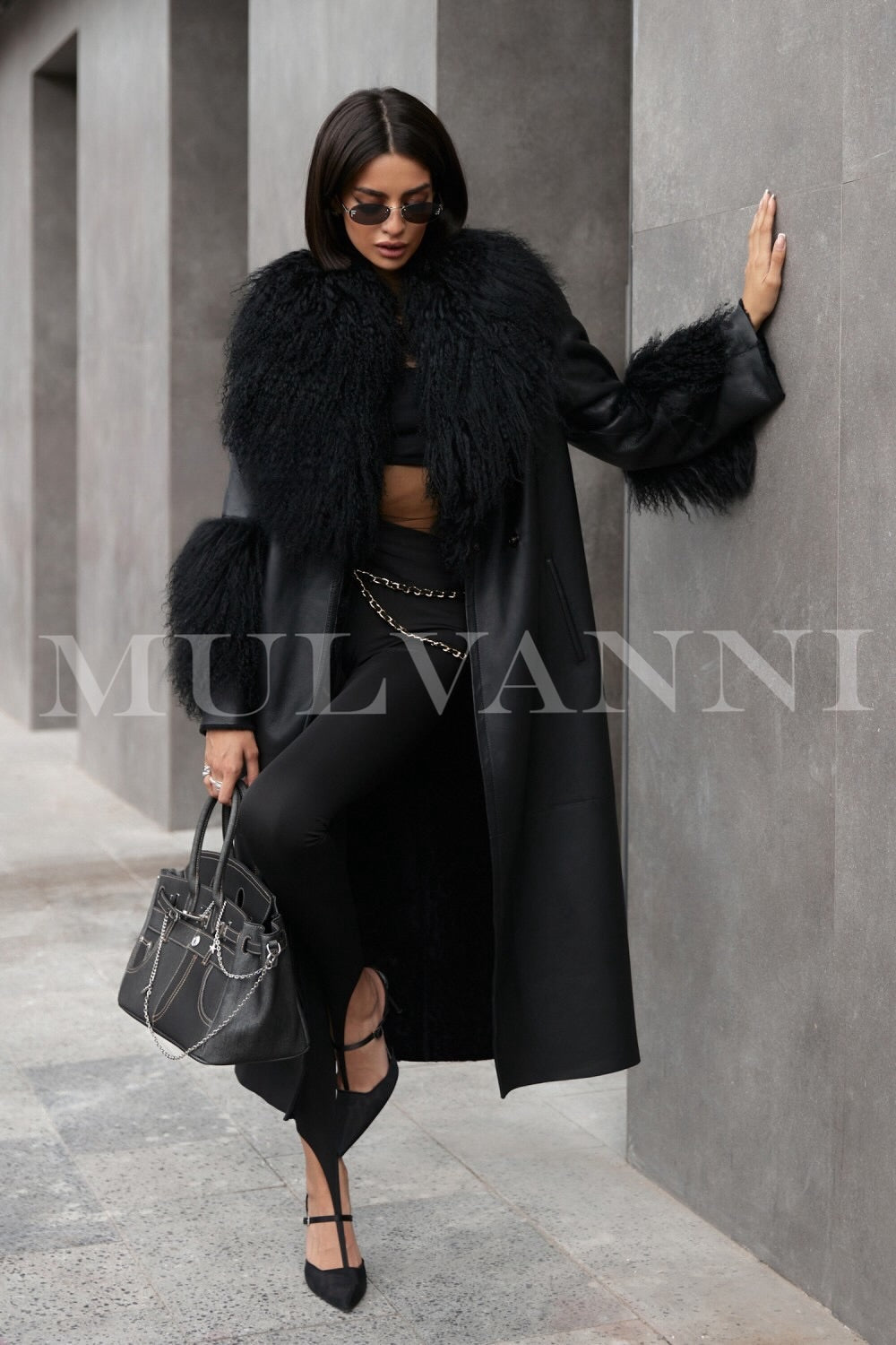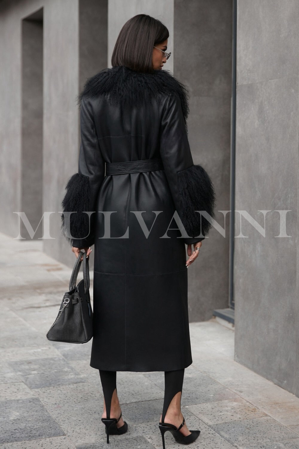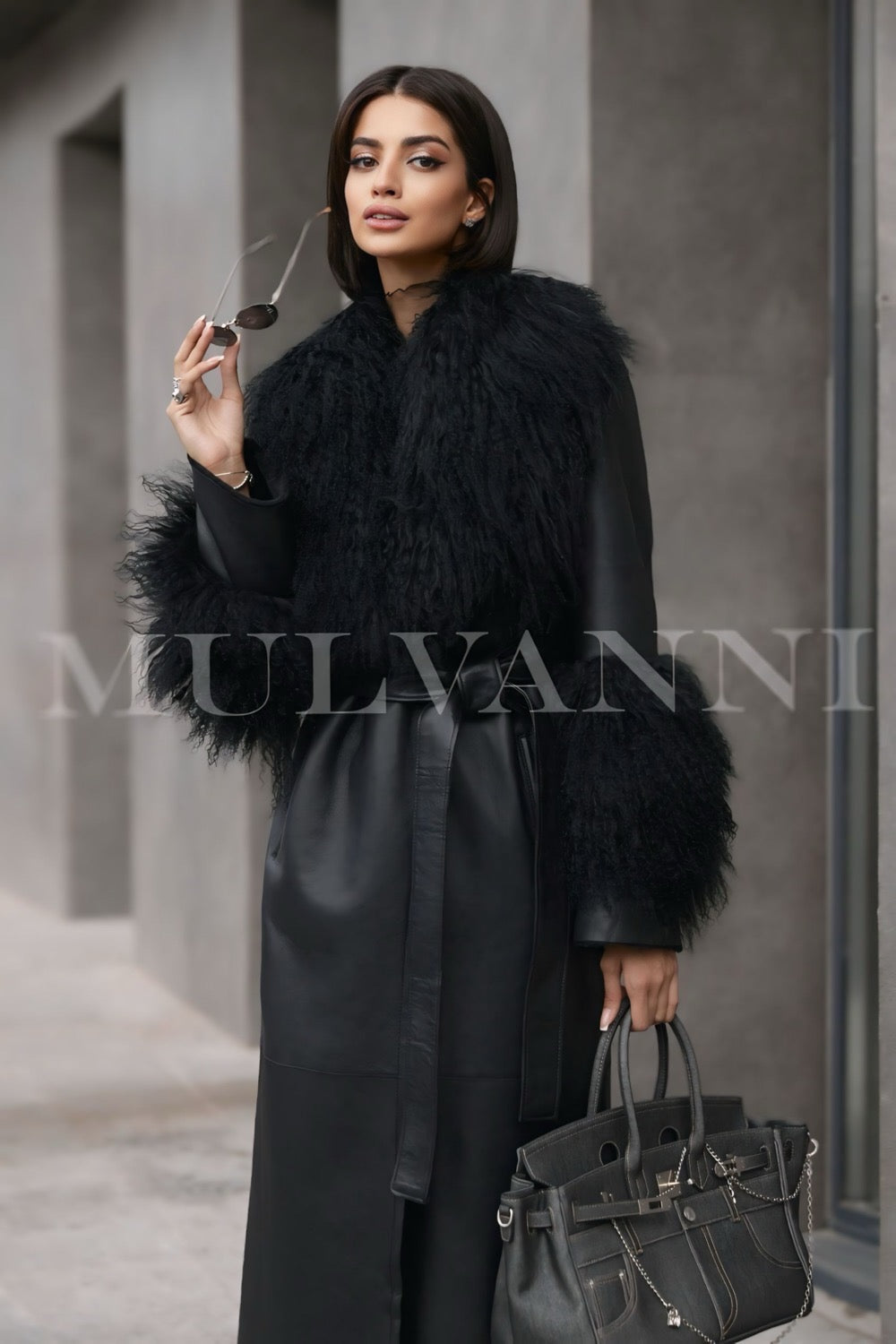 A woman wearing a black leather trench coat adorned with Mongolian fur at the collar and cuffs. The coat features a sleek design and fitted silhouette, combining luxury and style for a chic winter look.