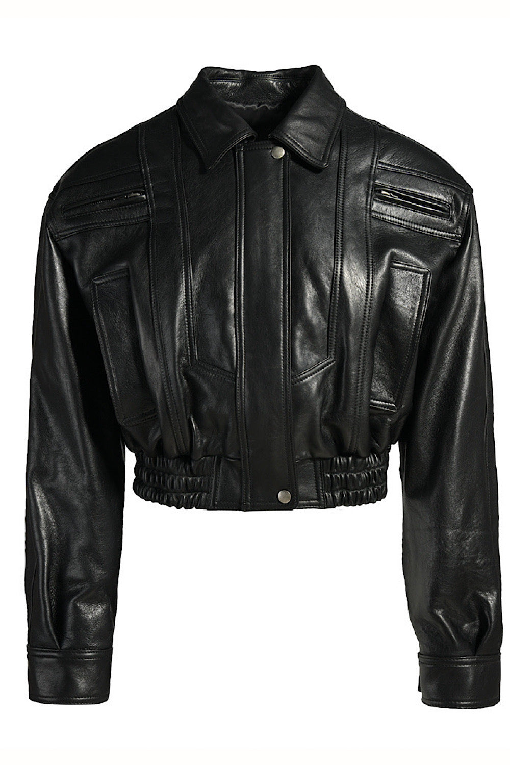 Crafted from ultra-soft genuine leather, this cropped bomber jacket delivers standout style with a refined finish. The modern silhouette sits just above the waist, blending contemporary edge with timeless appeal. It’s the perfect layering piece for the season—versatile, chic, and unmistakably sophisticated.